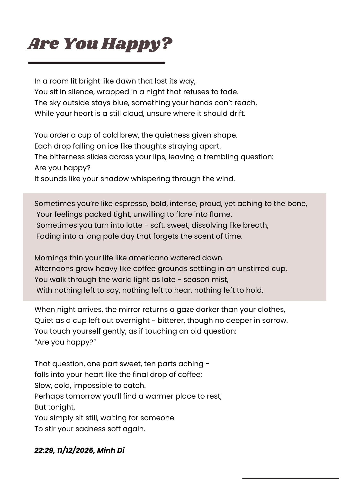Novel - Poem Are you happy? Posted on 11/12/2025 by dung Bài viết liên quan 1 Drifting Alone | Author Dugn Ngo 2 I Once Stood Against the World | Author Dung Ngo 3 Short Story 3: Joyful in the Storm 4 Number 6: You and I | Dung Ngo Author 5 Fear of love 6 Short Story 2: The Hammer 7 Short story: 2 dollars